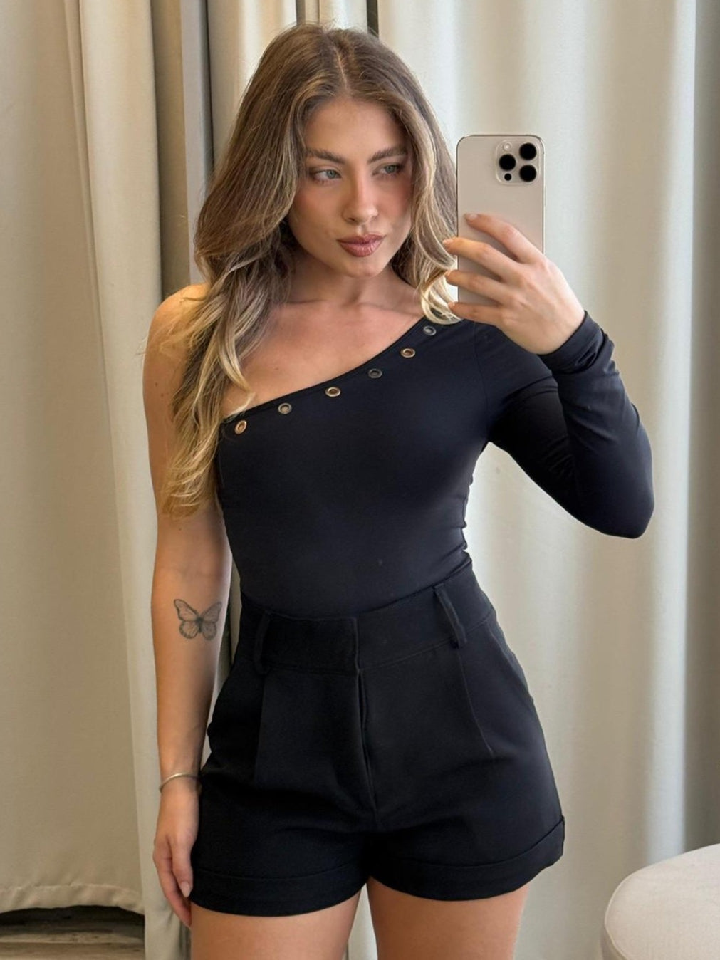 Confeccionado em poliamida de altíssima qualidade, este body possui design assimétrico com uma manga longa e outra ausente, trazendo um visual moderno e sofisticado. O decote é destacado por ilhoses bicolores, que adicionam personalidade à peça.