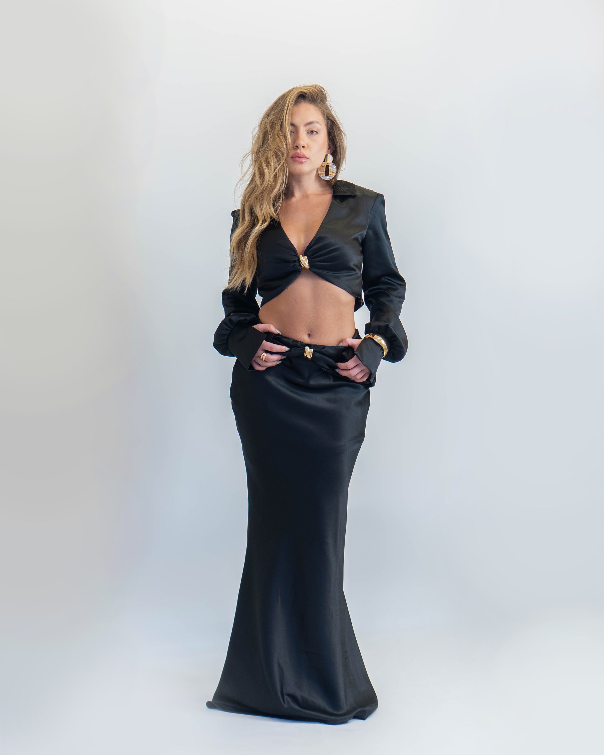 Vestido em malha Jersey dupla com costas nuas, proporcionando caimento impecável e conforto. O design evidencia detalhes que valorizam a silhueta e o colo.