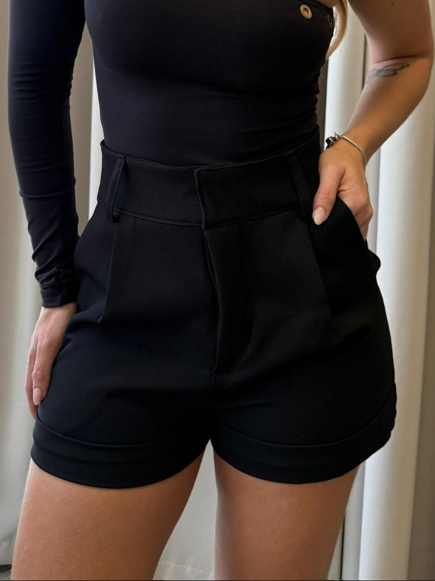 Shorts em tecido encorpado de alfaiataria com elastano, que oferece estrutura com leve elasticidade. Possui cintura alta, cós largo, pregas frontais e bolsos faca. Nas costas, conta com bolsos embutidos decorativos. O fechamento é frontal, com zíper comum e dois colchetes internos.
