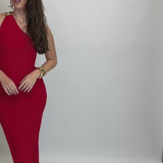 Vestido em tecido duplo com decote assimétrico (um ombro só) e franzido lateral ao longo do torso. Caimento reto da cintura até a barra.
