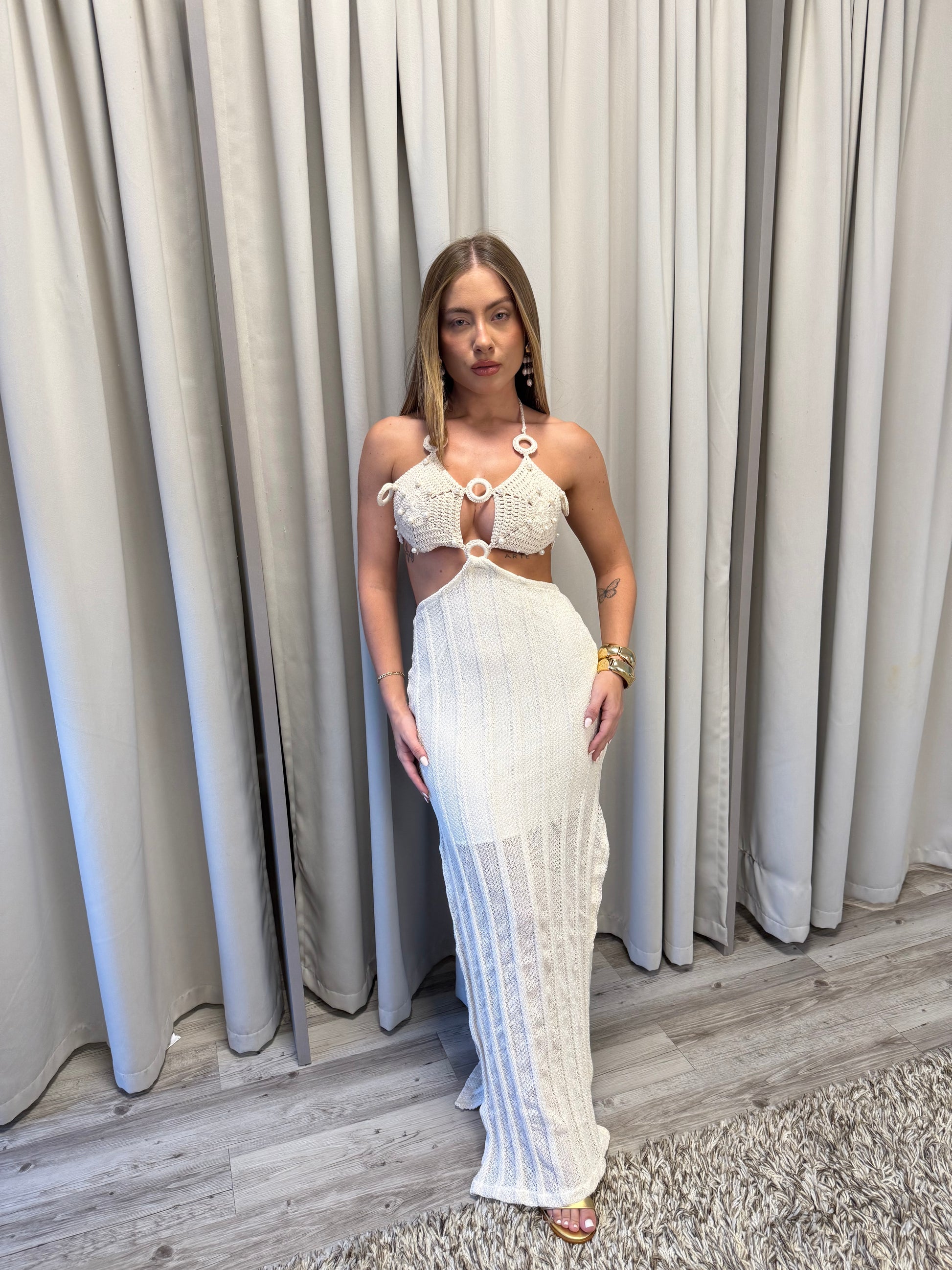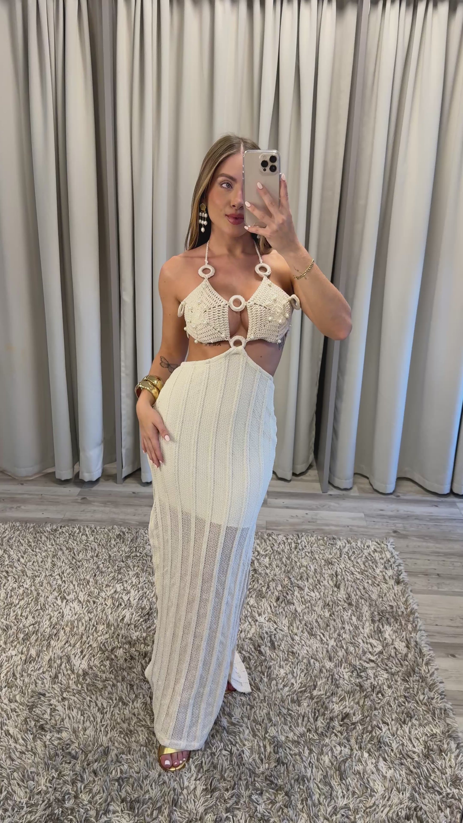 Vestido confeccionado em um composê de crochê manual e malha tricô com fios de lurex, possui alças finas que fazem amarração na parte posterior do pescoço e costas, busto em formato geométrico, todo bordado em pérolas e detalhe de argolas nas alças e junção do busto, decote e laterais do busto, saia longa com recorte estrategico na cintura, elástico na parte posterior das costas, meio forro, fendas laterais, comprimento longo, shape justo e não possui fechamento.