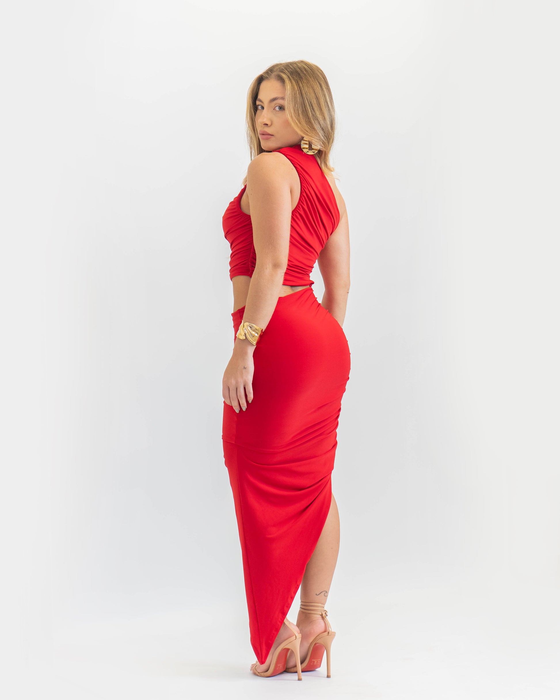 Vestido em poliamida com tecido duplo, decote de um ombro só e franzido lateral do busto à barra. Possui recorte lateral na altura da cintura, frente e costas, e saia assimétrica que acompanha o franzido.