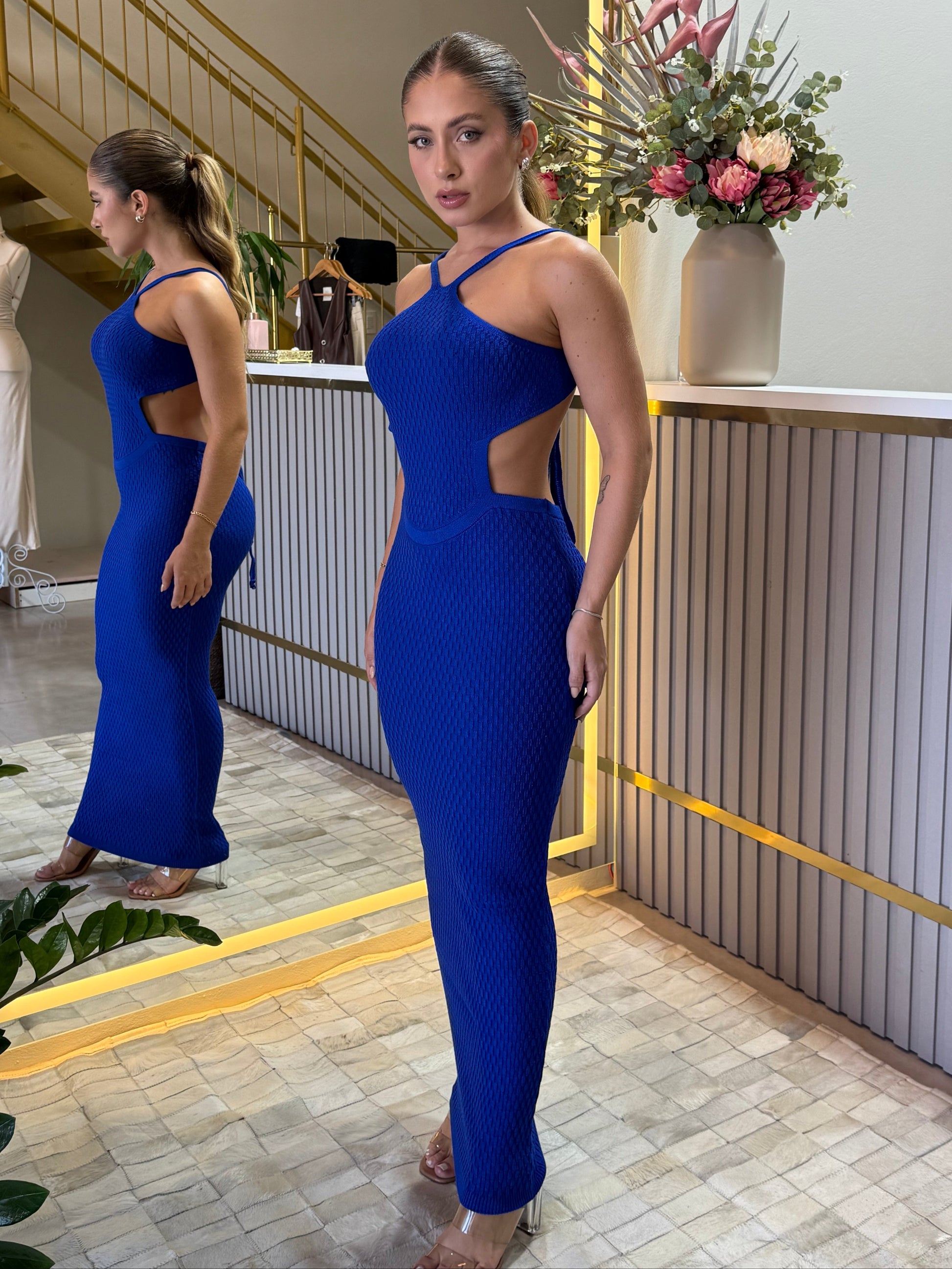 Vestido em tecido tipo tricot com cava americana, recortes laterais e costas nuas. Possui alças finas e fechamento nas costas por amarração, que garante ajuste perfeito ao corpo.